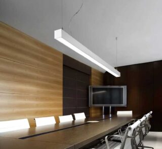 Luminaria lineal para sobreponer en pared. Cuerpo en aluminio extruido + Policarbonato, difusor en polimetilmetalcrilato (PMMA). Sistema Ajustable de guaya.